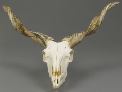 Echter Ziegenschädel von einem Ziegenbock der Rasse Saanenziege. Der Bock war enthornt und hat darum eine interessante Knochenstruktur auf dem Schädel.