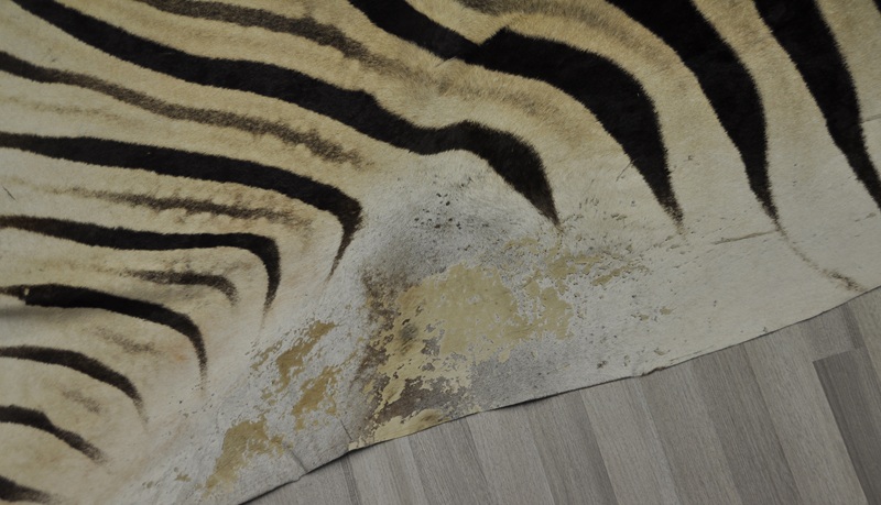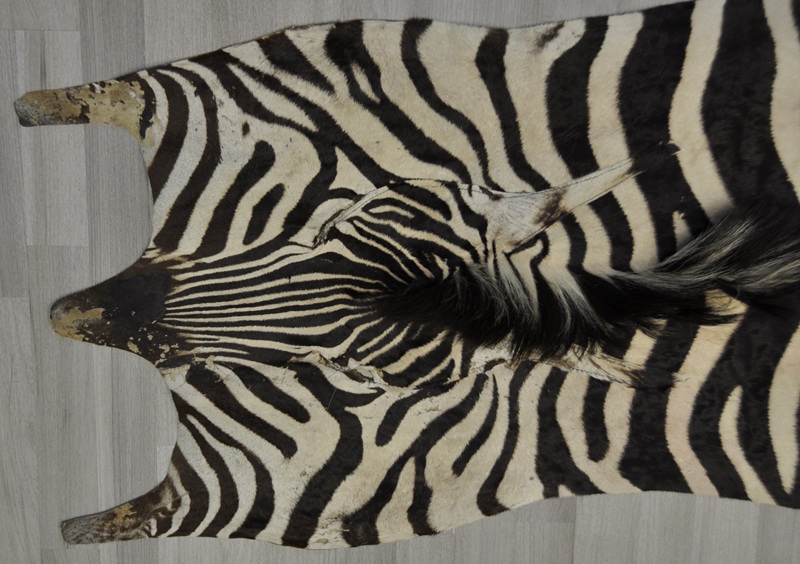 Fell eines Steppenzebras. 3. Wahl Fell (Kahlstellen im Gesicht und Randbereich des Felles). Ideal zum Zerschneiden (für Sockel von Tierpräparaten, Kissen, Taschen usw.). Weich gegerbt, ideal für Dekozwecke im Interieur-Bereich.