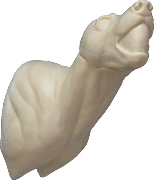 Grosser afrikanischer Elefantenbulle, Kopf und Hals, gerade. Rüssel ist separat geschäumt. Äussere Schicht aus festem Pu-Schaum, innen weicherer Schaum.